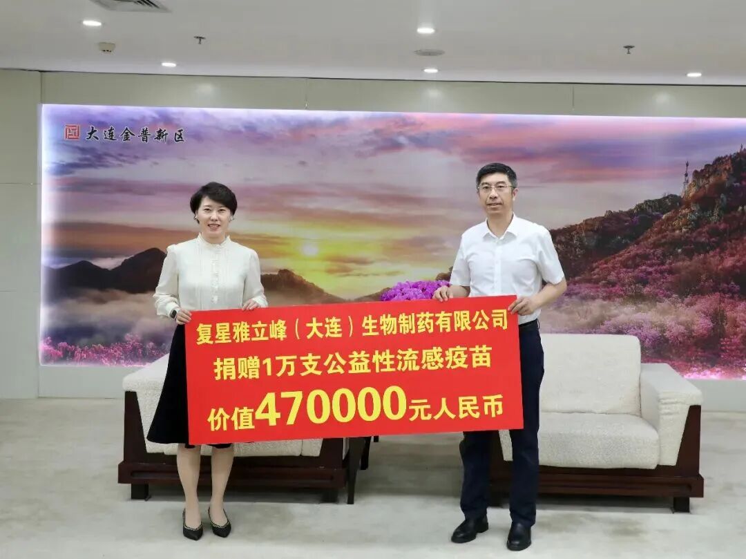 复星雅立峰(大连)生物制药有限公司成立于2002年,注册资本4亿元,公司位于金普新区湾里街道,是一家专门从事疫苗研发、生产及销售的生物制品企业,主要产品包括流感病毒裂解疫苗及人用狂犬病疫苗。公司获评高新技术企业、瞪羚企业、大连市制造业百强企业,并获得CNAS实验室认证、ISO14001体系认证、ISO45001体系认证。本次复星雅立峰(大连)生物制药有限公司通过新区红十字会向金普新区捐赠1万支流感疫苗,价值人民币47万元。这不仅仅是一次物资的传递,更是一份守护生命与健康的深厚情谊,企业以实际行动践行了社会责任与担当,展现了企业关心支持公益事业、心系社会、回馈社会的高尚情怀。
